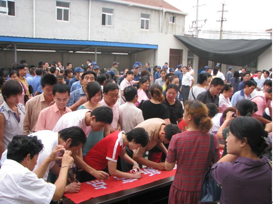 8、农民工纷纷在“人人争当守法新市民,个个素质提升新高点”的条幅上签字。
