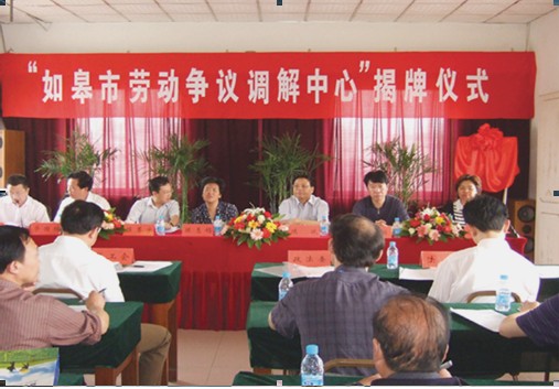 市总工会等8个部门于2008年5月联合组建如皋市劳动争议调解中心,图为揭牌仪式。
